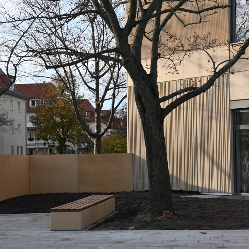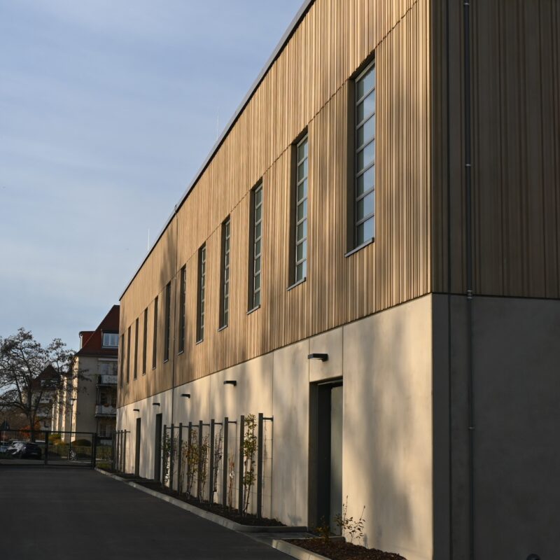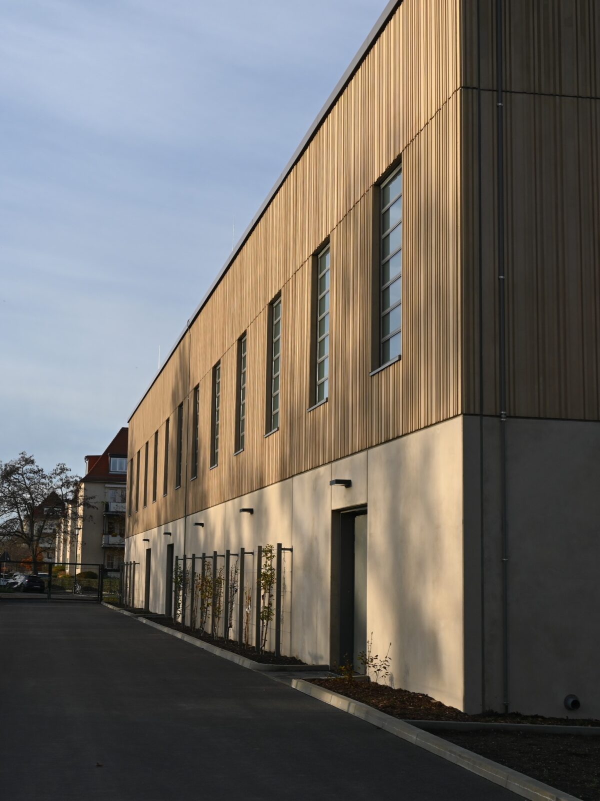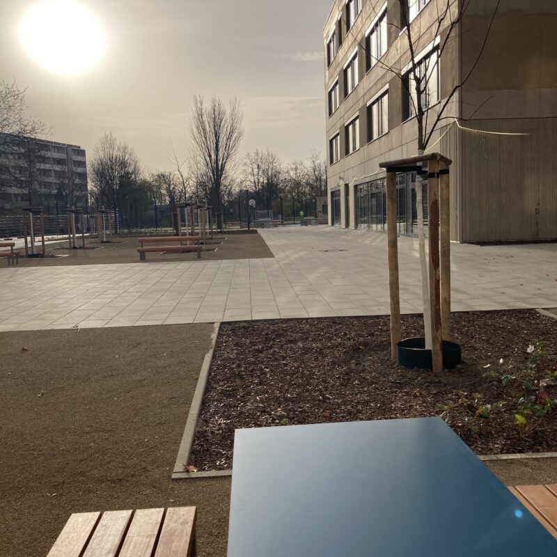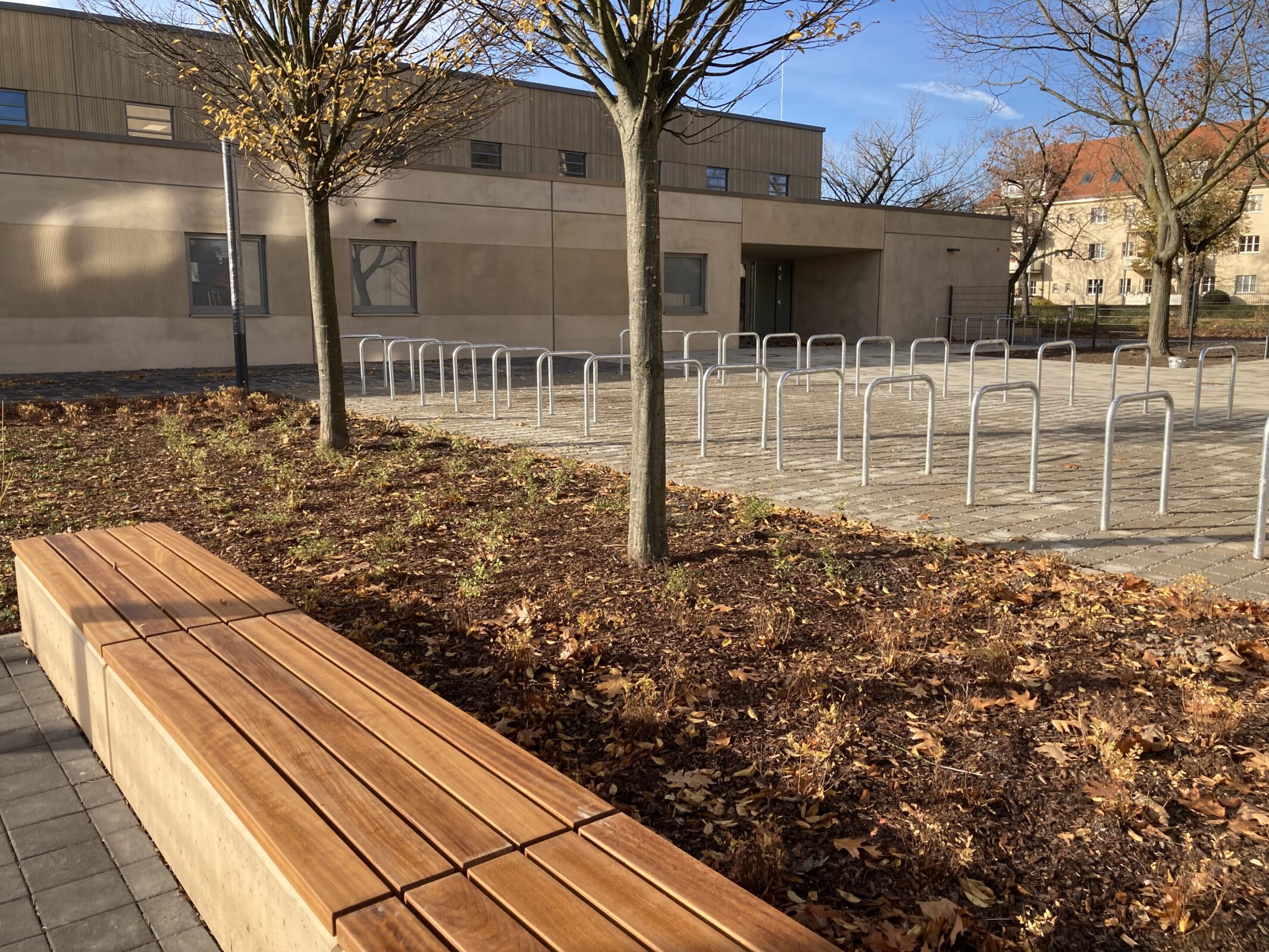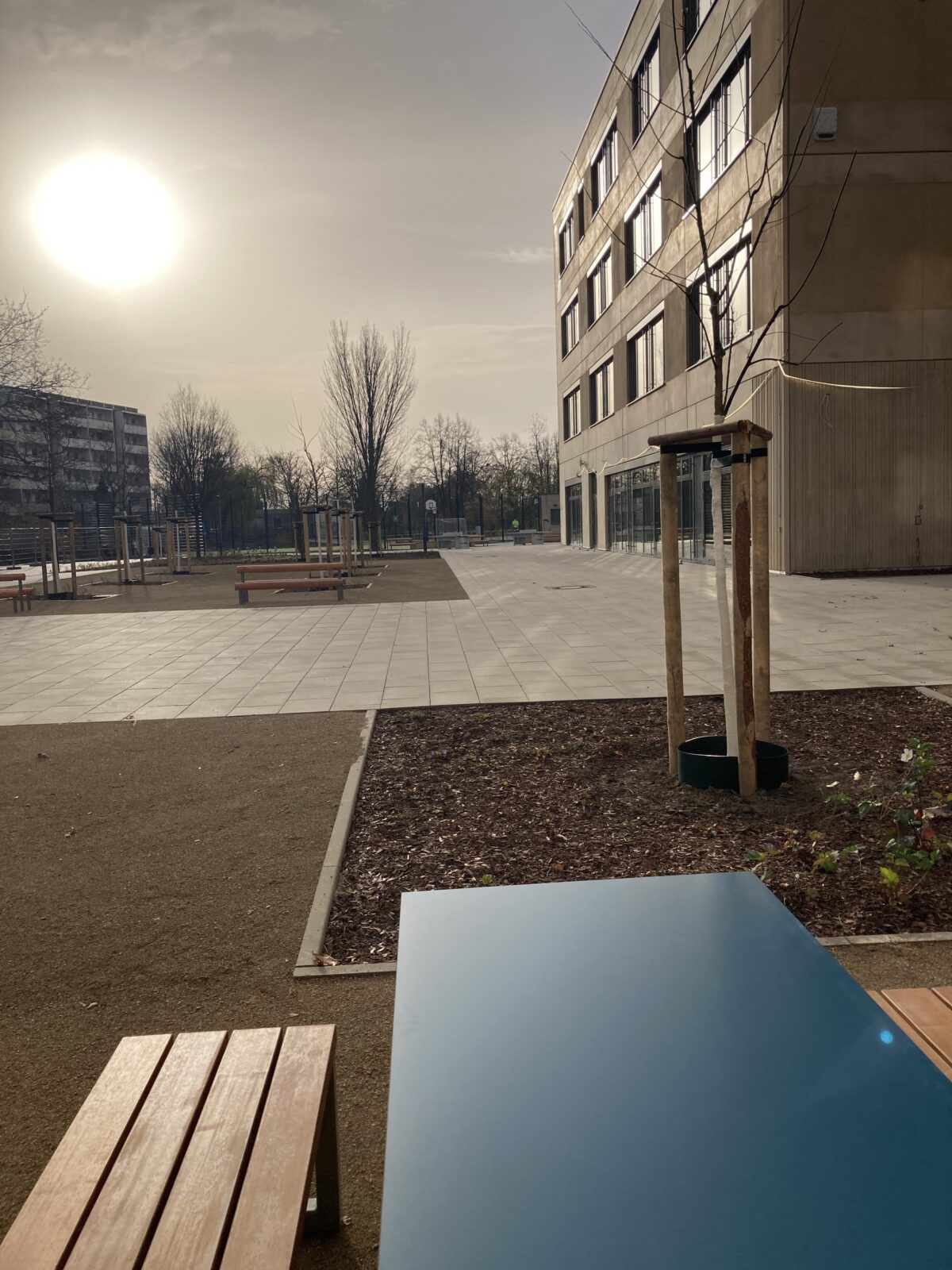 Mit der Fertigstellung der Sport- und Außenanlagen ist der Schulbetrieb des Gymnasiums und der dazugehörigen Sporthalle nun komplett aufgenommen worden. Nach dem Rückbau der Containerinterimschule wird auf den rückwärtigen, freiwerdende Außenflächen noch als letzter Baustein ein „grünen Klassenzimmer“ ergänzt.