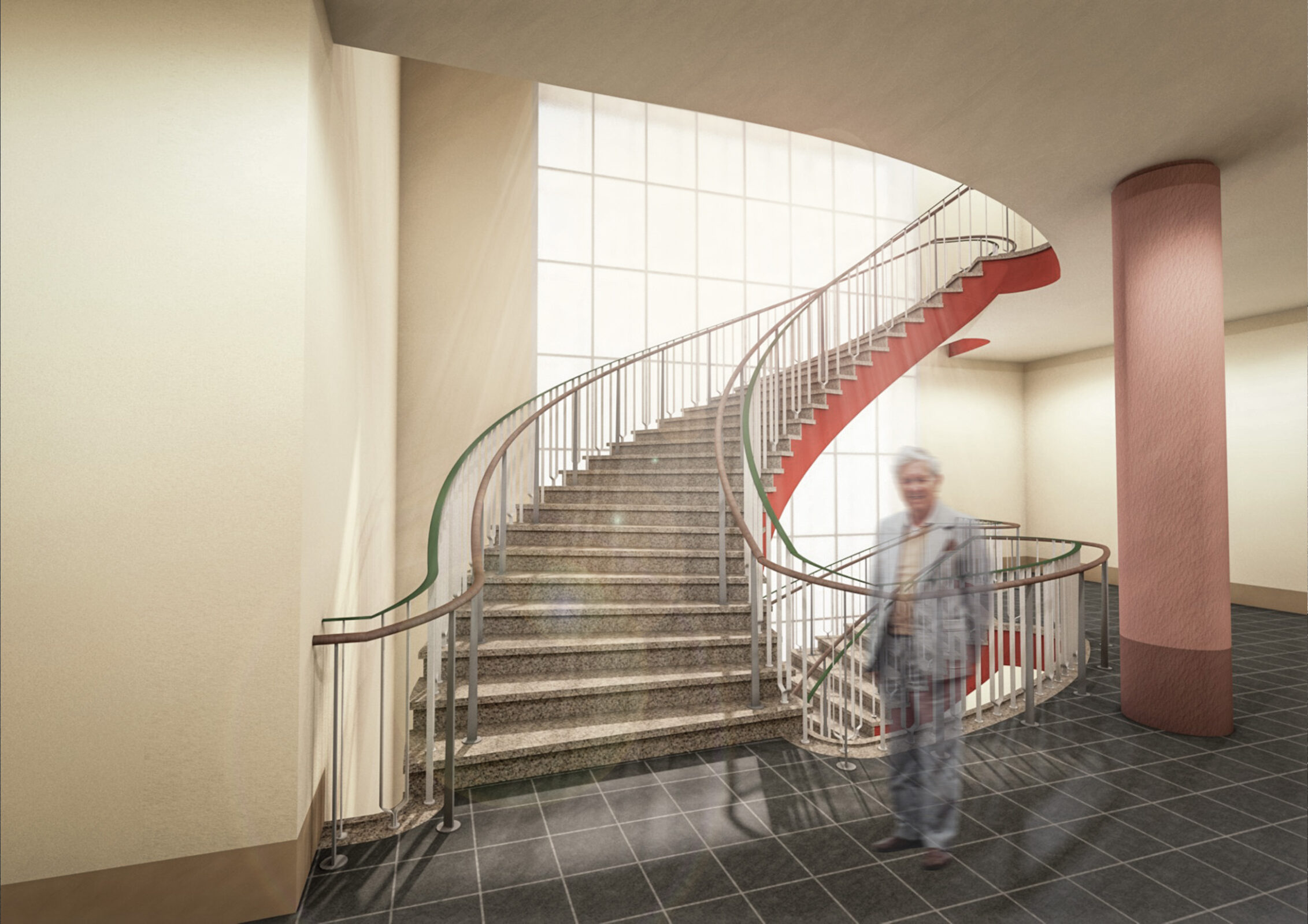 • Innenraumperspektive der Haupttreppe im Erich-Rammler-Baus. Die steinerne Treppe ist geschwungenen und liegt vor einem Raumhohen Fenster. Der Raum wirkt offen und hell.