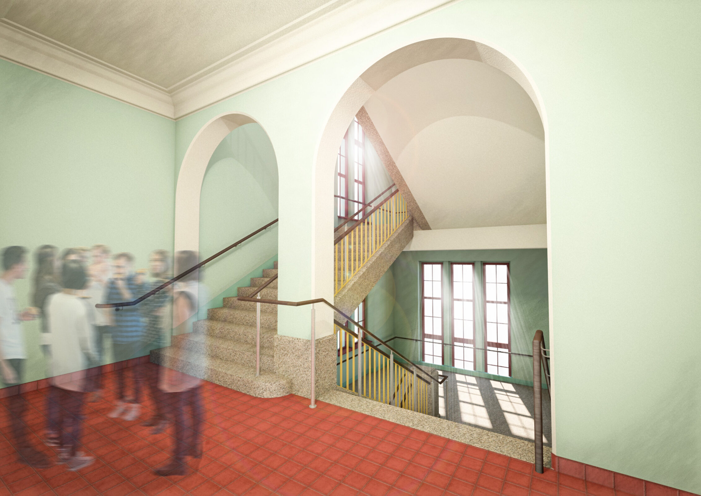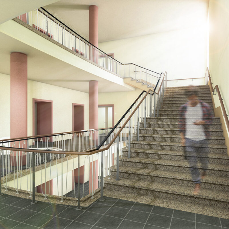 • Innenraumperspektive im Treppenhaus des Erich-Rammler-Baus. Das Sonnenlicht scheint durch die Fenster