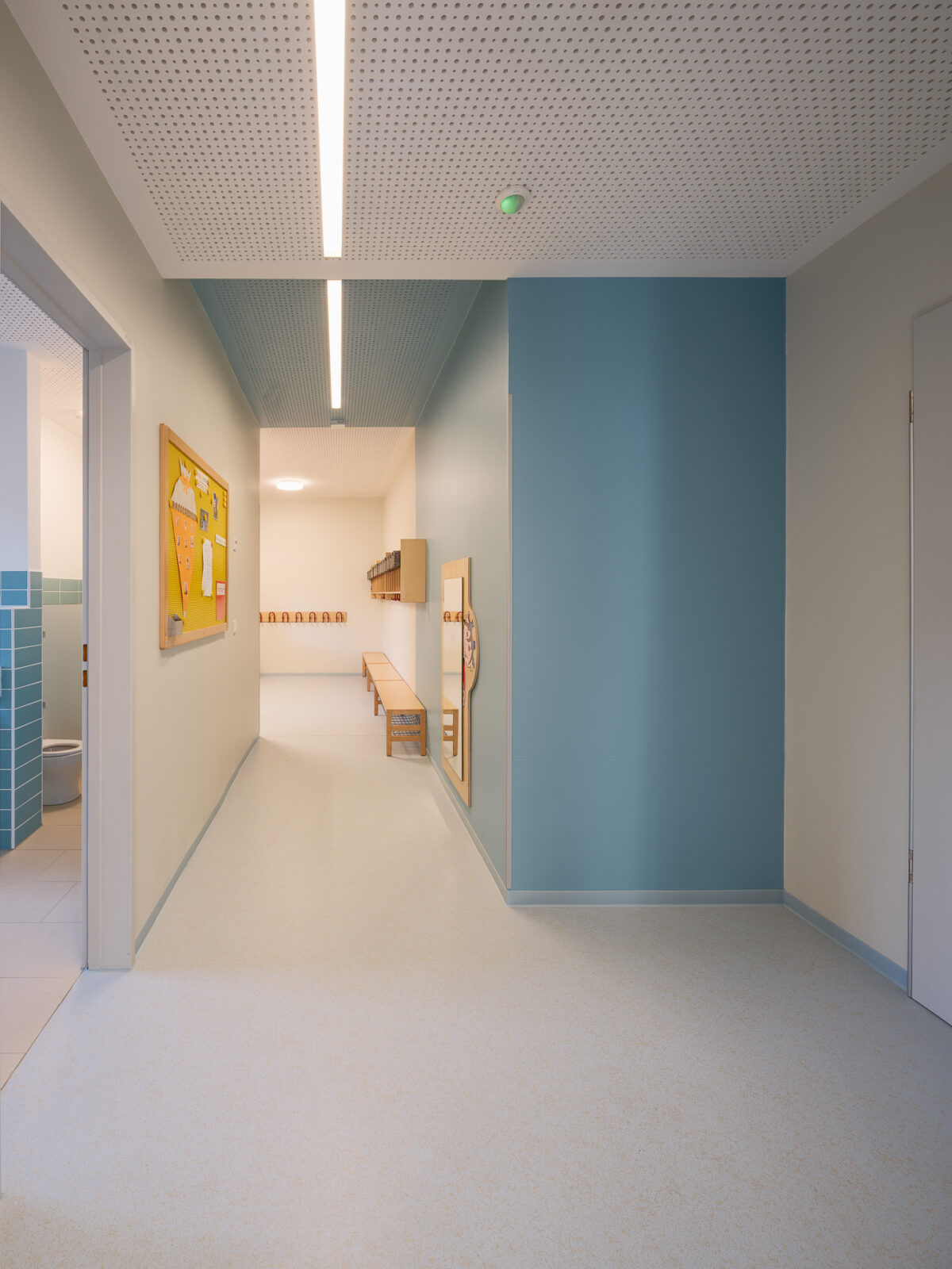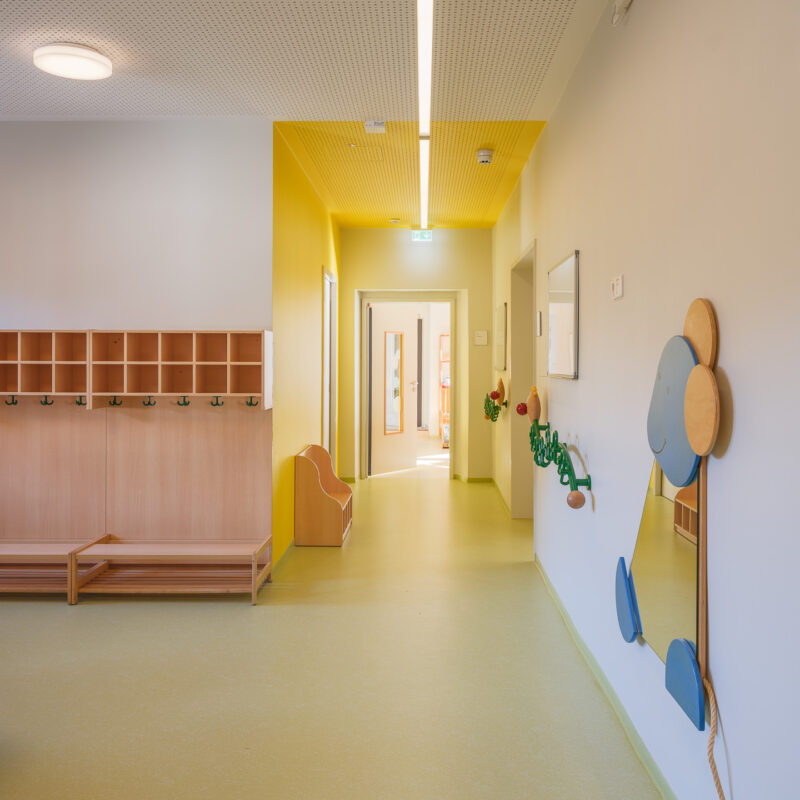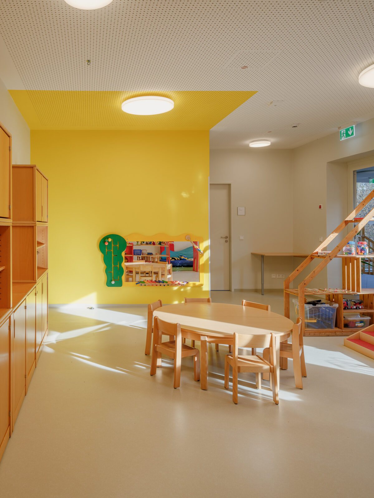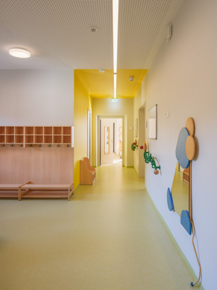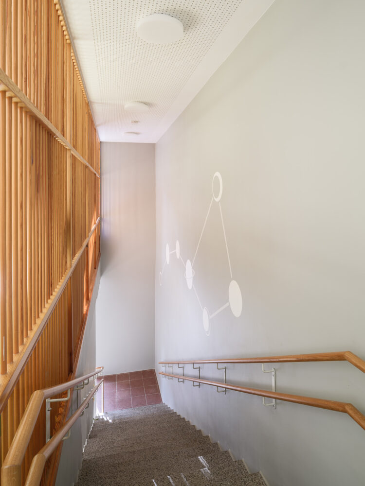 Das Gestaltungskonzept nimmt Bezug auf die namensgebende Sonnenuhr, die die Außenwand zum Garten schmückt. Bereits im Eingangsbereich wird dieses Motiv aufgegriffen: Das als Sonnensystem gestaltete Foyer dient als zentrales Erschließungselement und schafft eine identitätsstiftende Atmosphäre.
