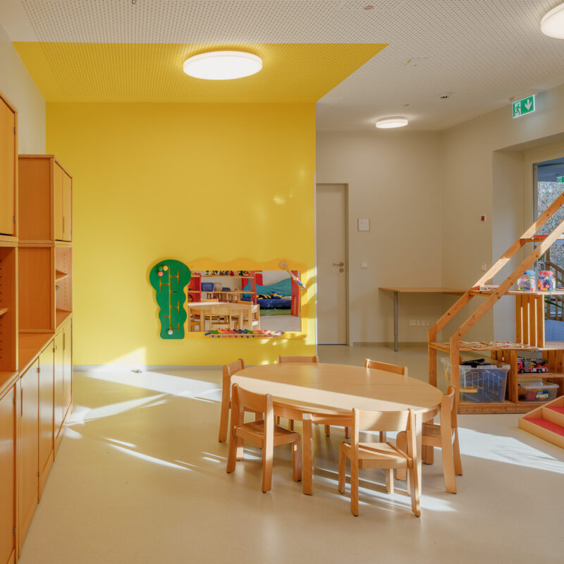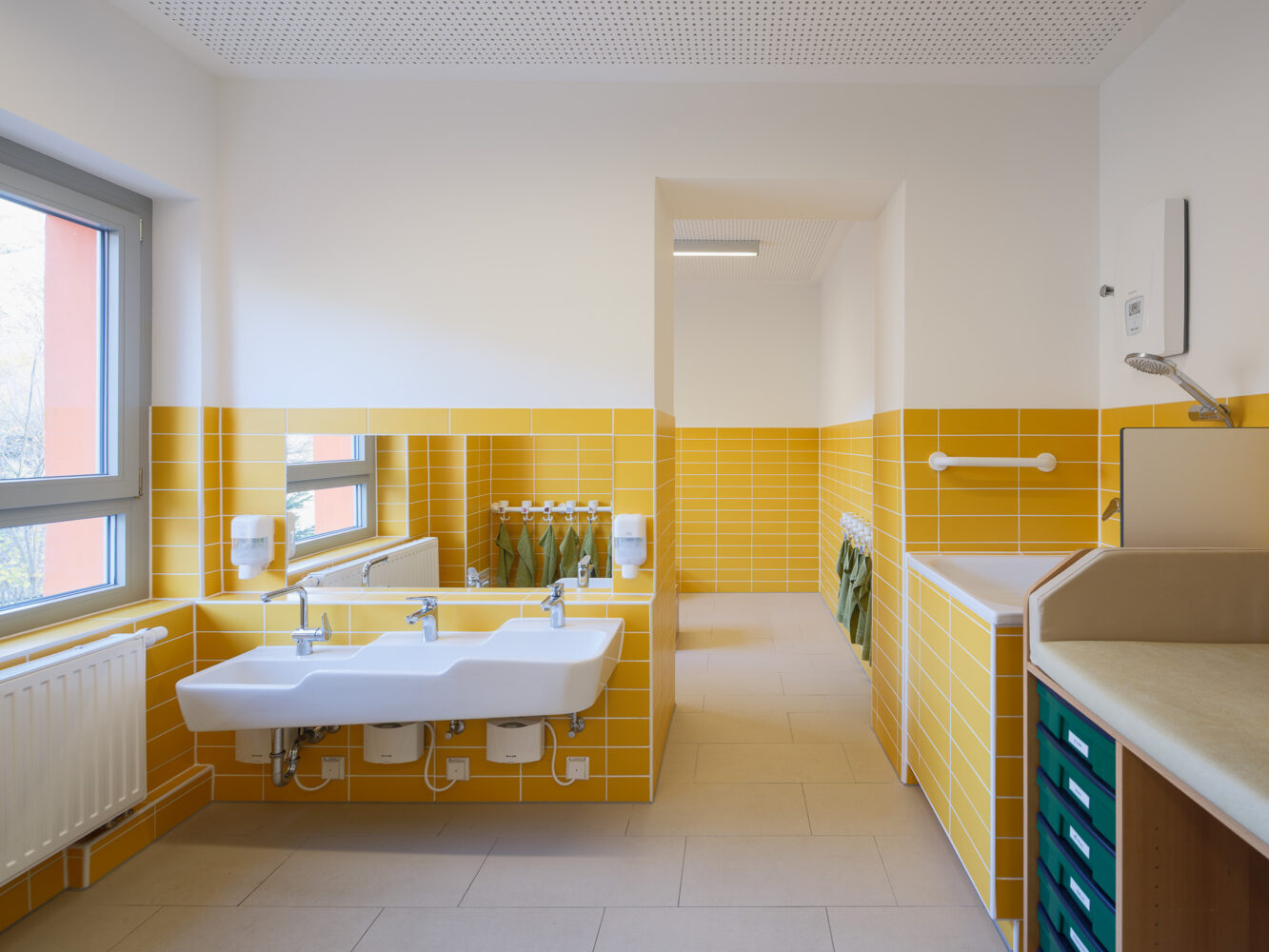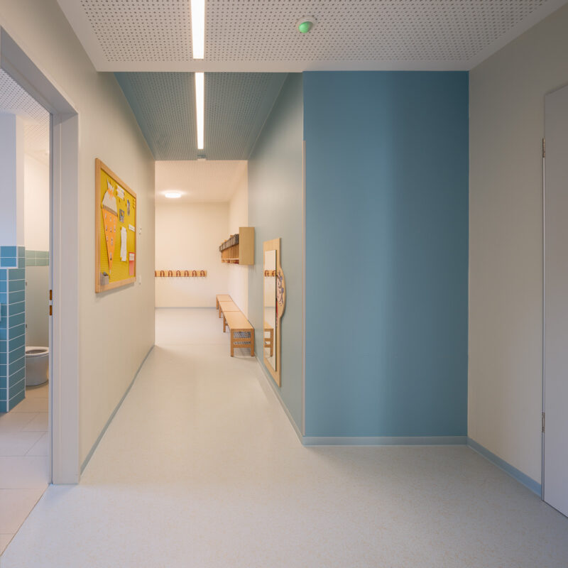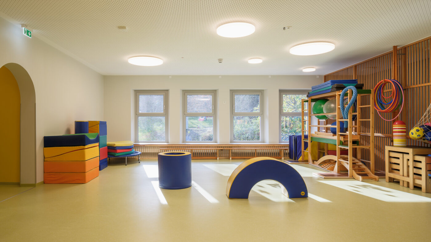Das Gestaltungskonzept nimmt Bezug auf die namensgebende Sonnenuhr, die die Außenwand zum Garten schmückt. Bereits im Eingangsbereich wird dieses Motiv aufgegriffen: Das als Sonnensystem gestaltete Foyer dient als zentrales Erschließungselement und schafft eine identitätsstiftende Atmosphäre.