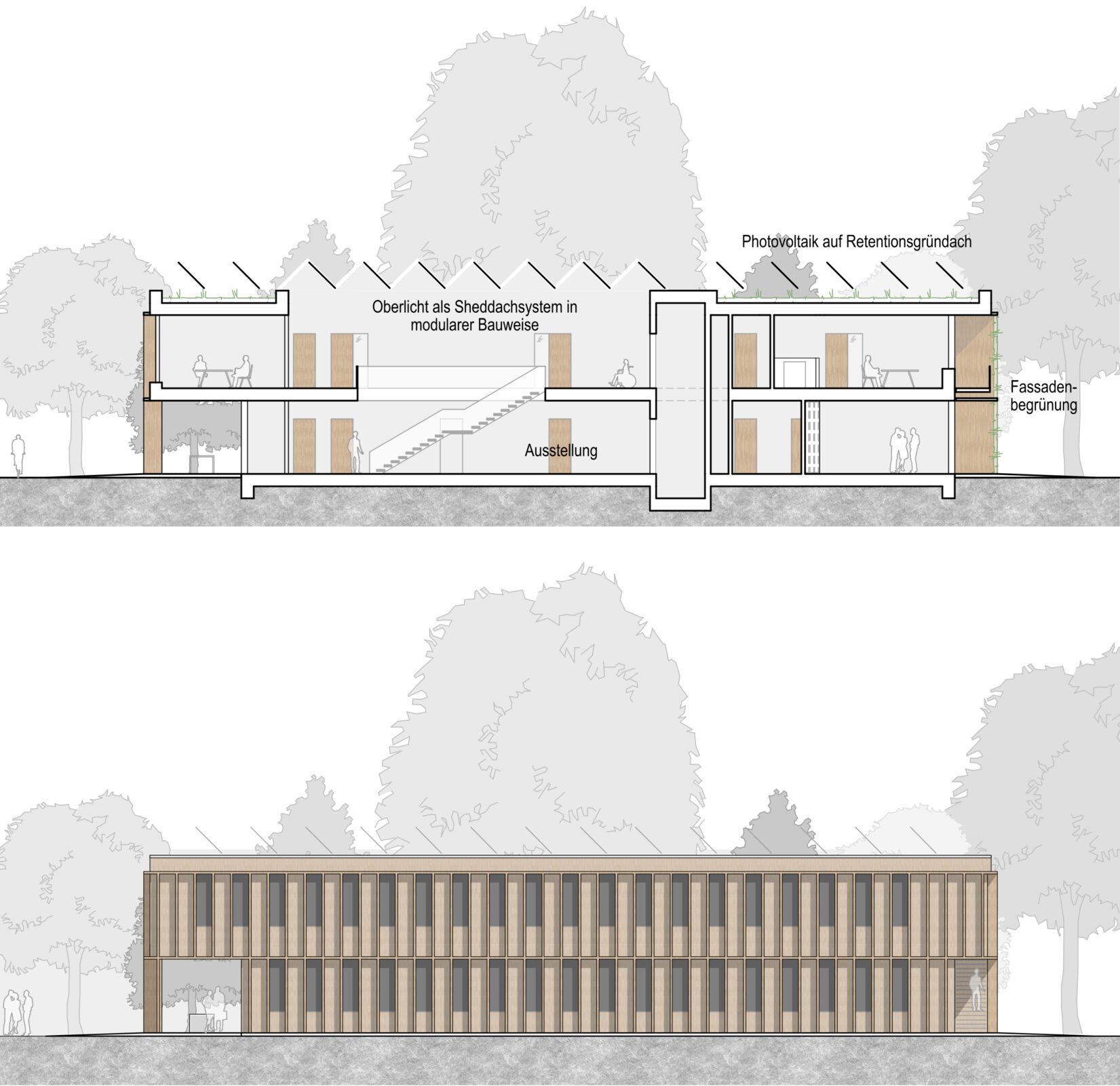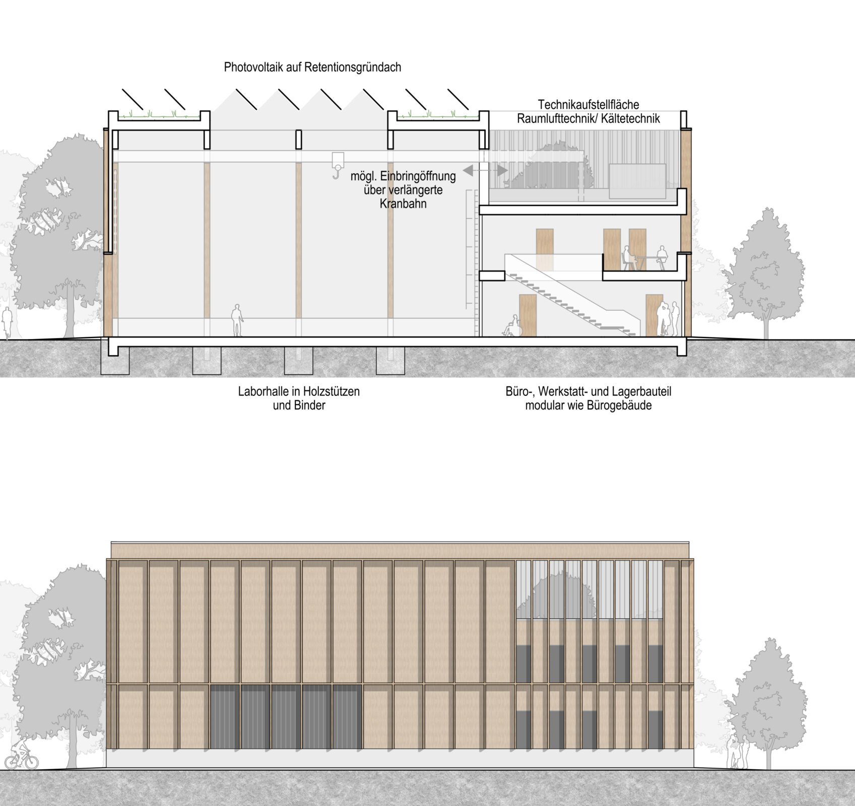 Die beiden Gebäude sind in Modul- und Holzbauweise geplant und sollen dem Institutsmitarbeitenden neue Arbeitsplätze bieten sowie den neuesten Versuchsstände zur Erforschung der Energie- und Geothermie zu ermöglichen.